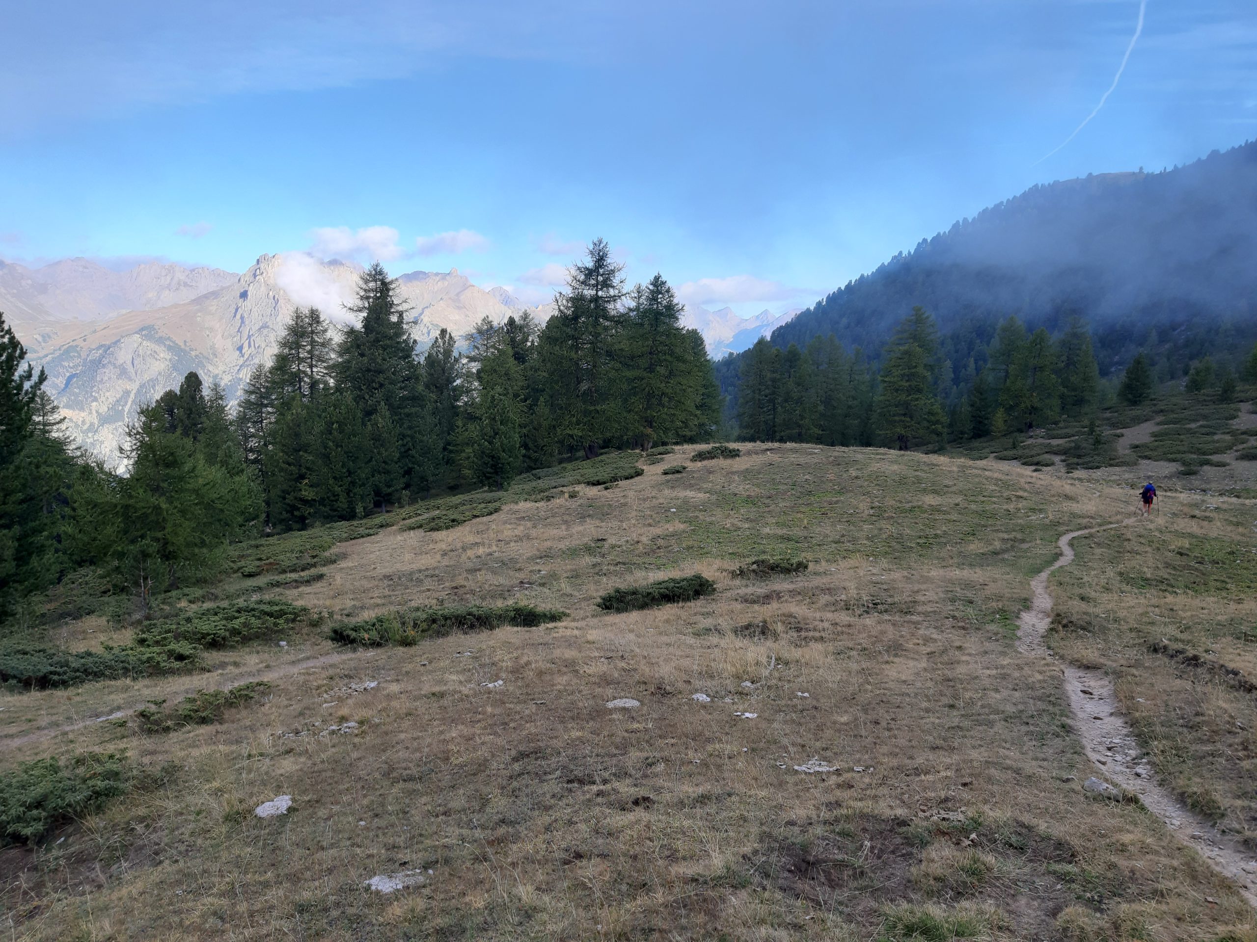 On s’élance dans ce fabuleux cadre. C’est l’heure de la looooongue descente sur Ceillac (1639m). Longue mais pas trop pentue. C’est cool. C’est pas traumatisant pour les cuisses qui commencent quand même à accuser le coup. Bah oui, j’ai même pas pu les étendre cette « nuit ».