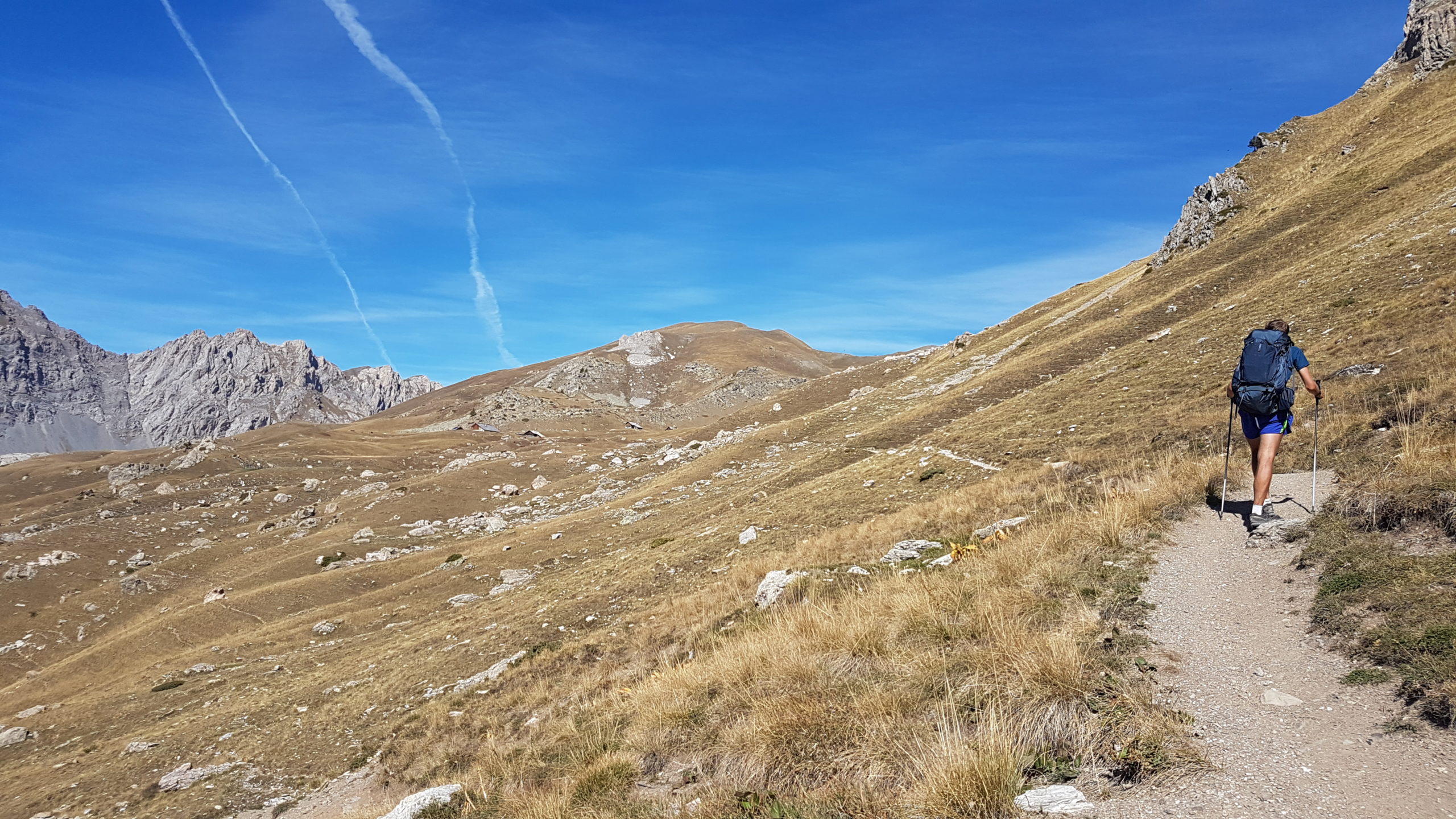 Ça a tout de même le don de m’apaiser un peu. Je retrouve un peu le plaisir. La température baisse légèrement avec le vent. J’essaye de me résonner. Je me focalise sur le paysage. Ce magnifique paysage. Exactement comme je l’aime. Dégagé. Sauvage. Dépouillé de tout signe humain. Cette technique fonctionne jusqu’au Col, le Col de Furfande (2293m). LE DERNIIIIEEERRRR !!!