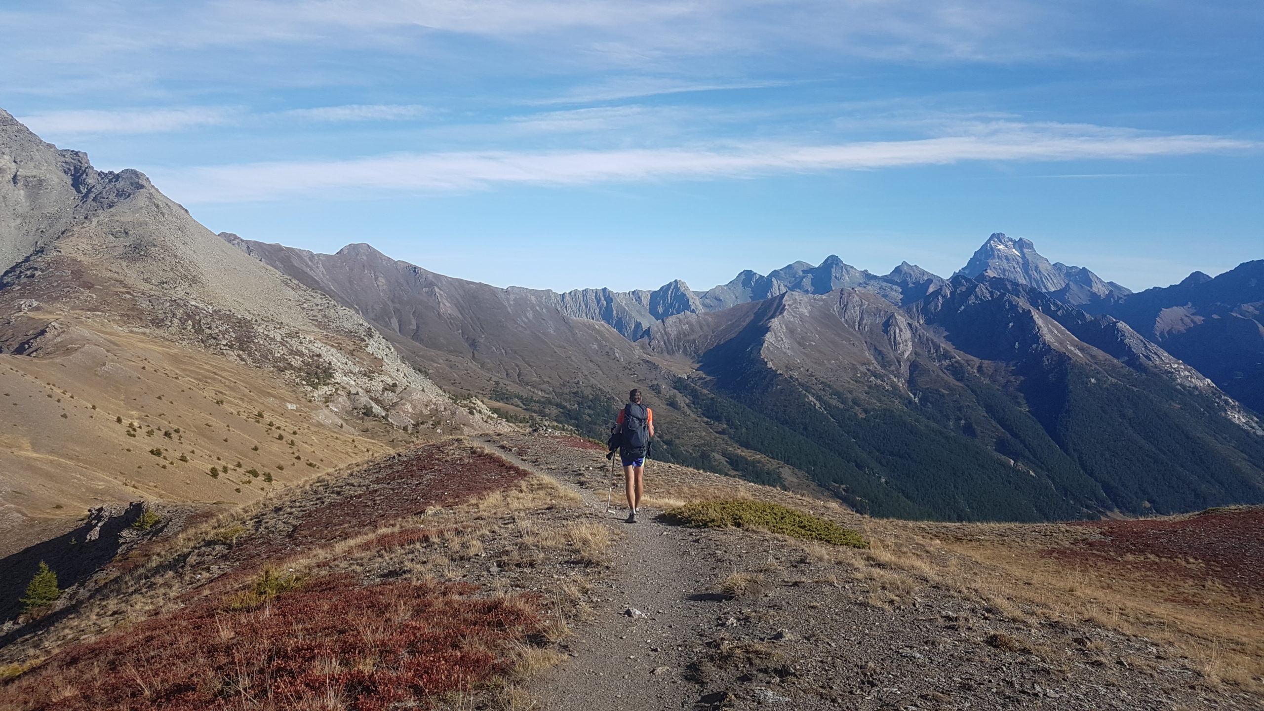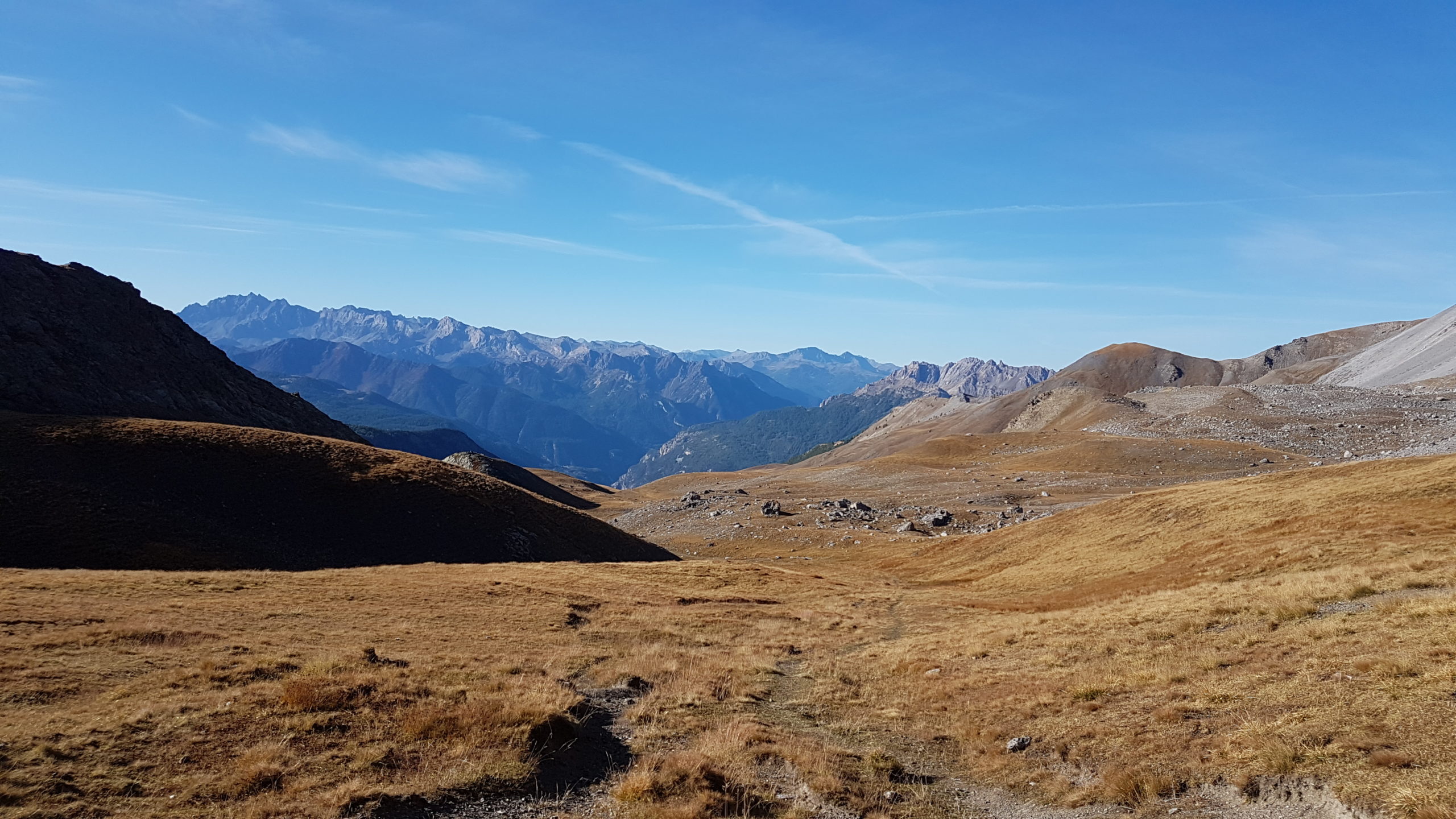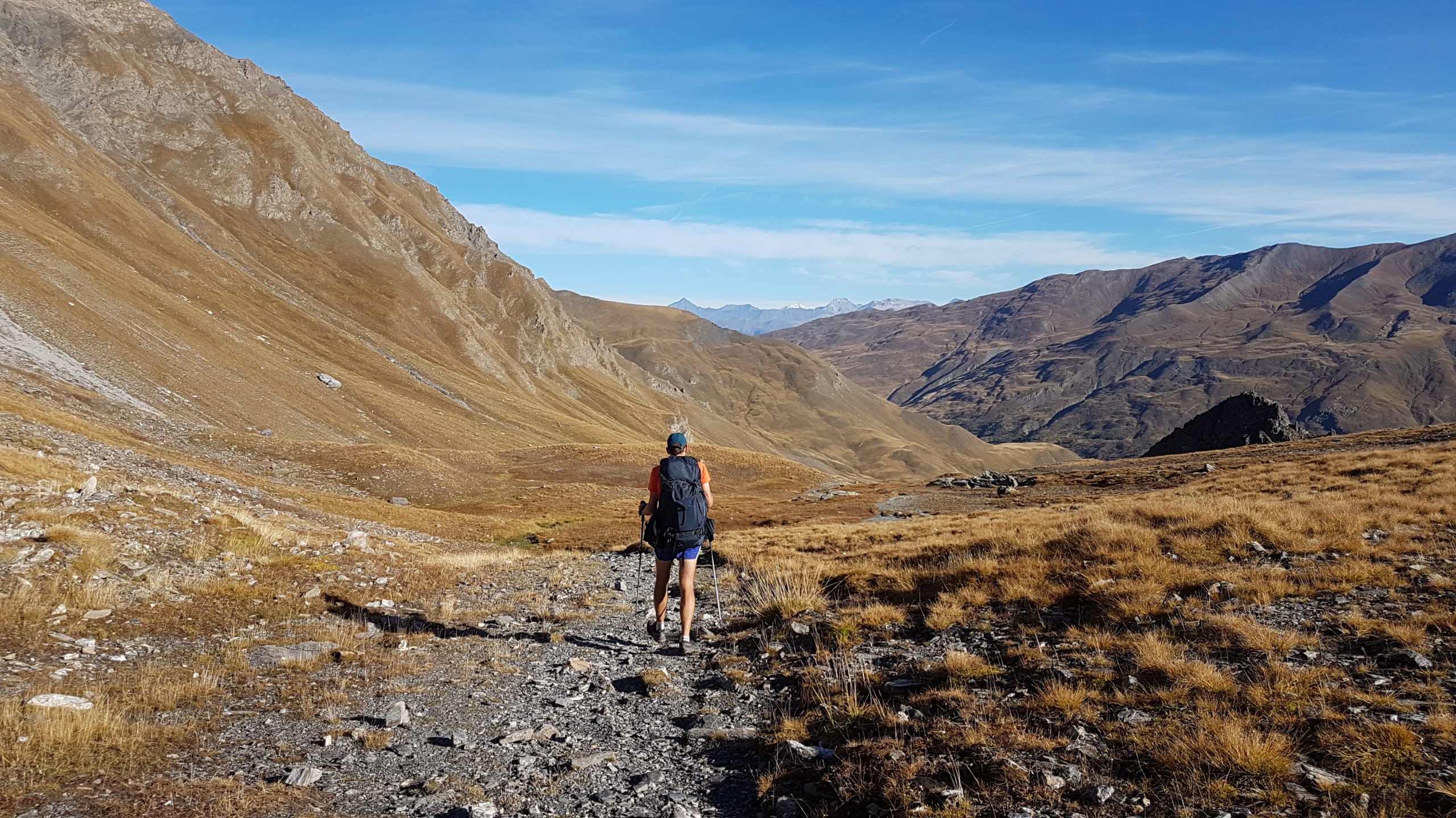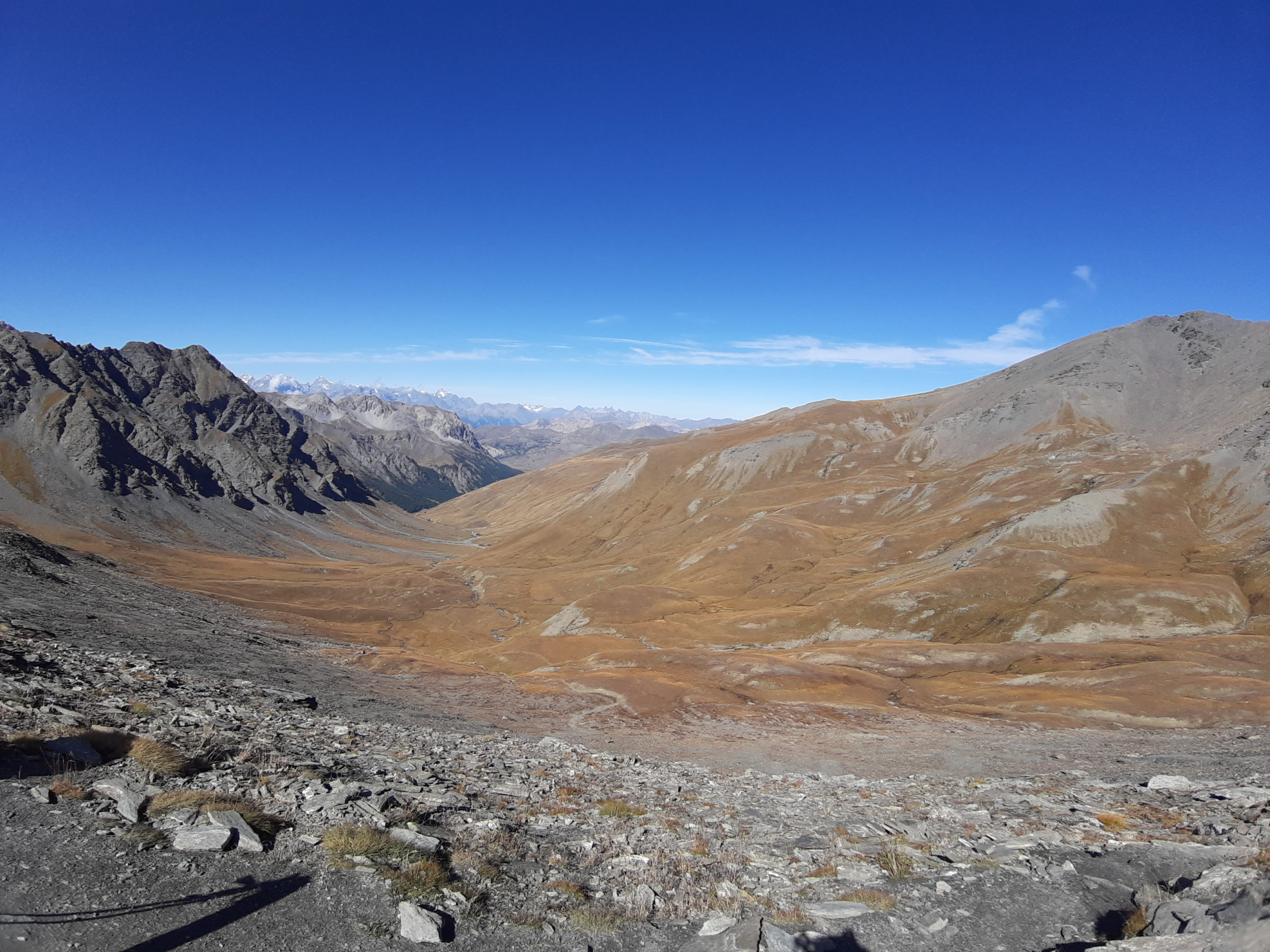 A trop regarder le paysage, on arrive au col sans s’en rendre compte. Seul le vent nous ramène à la raison et nous le rappelle. La vallée de Cervières se dessine devant nous. Qu’elles sont belles ces couleurs automnales ! J’ai envie de m’asseoir et de les contempler pendant des heures, figeant chaque détail dans ma mémoire. Mais je me rappelle rapidement qu’il reste pas mal de bornes tout de même.