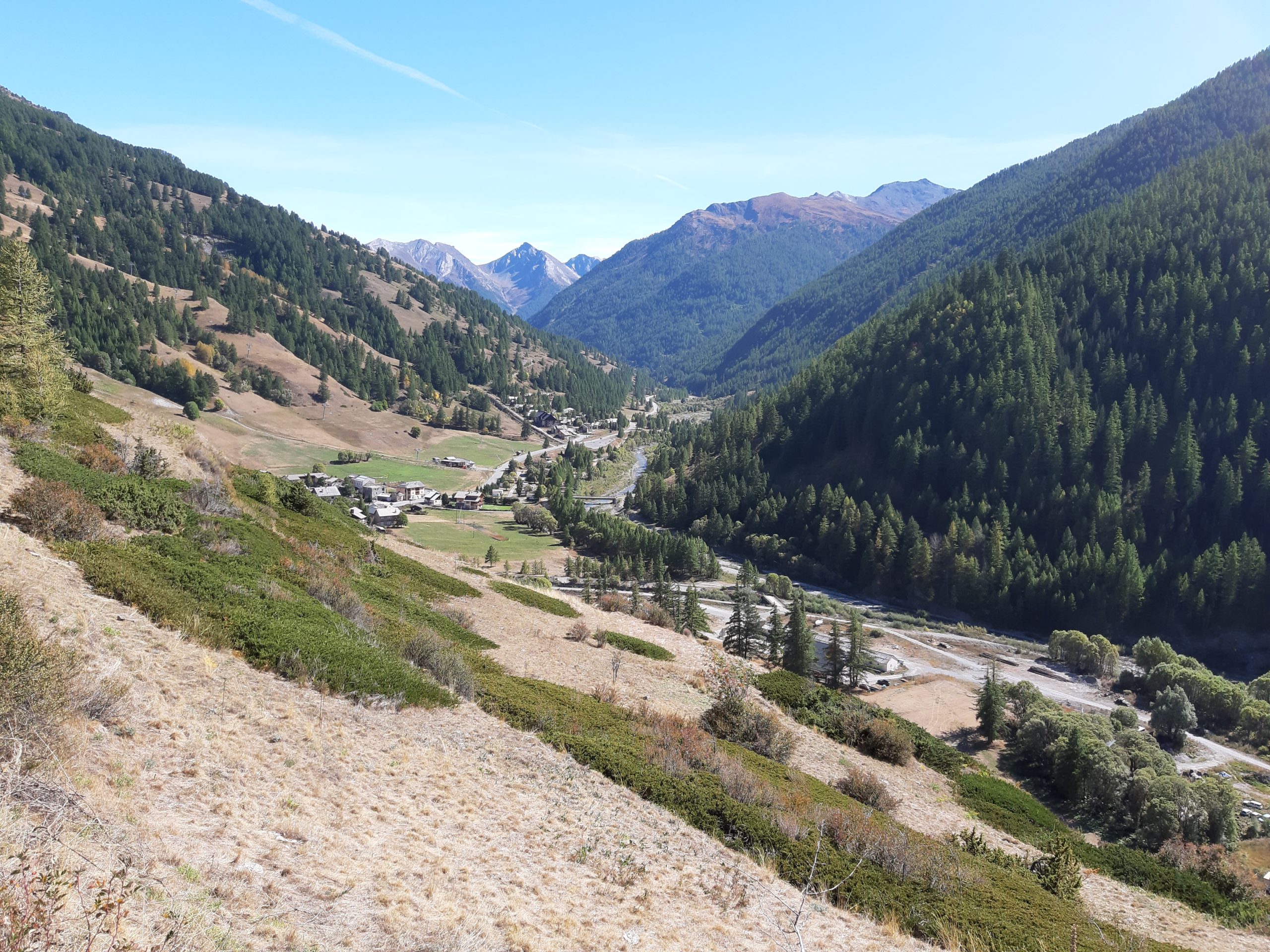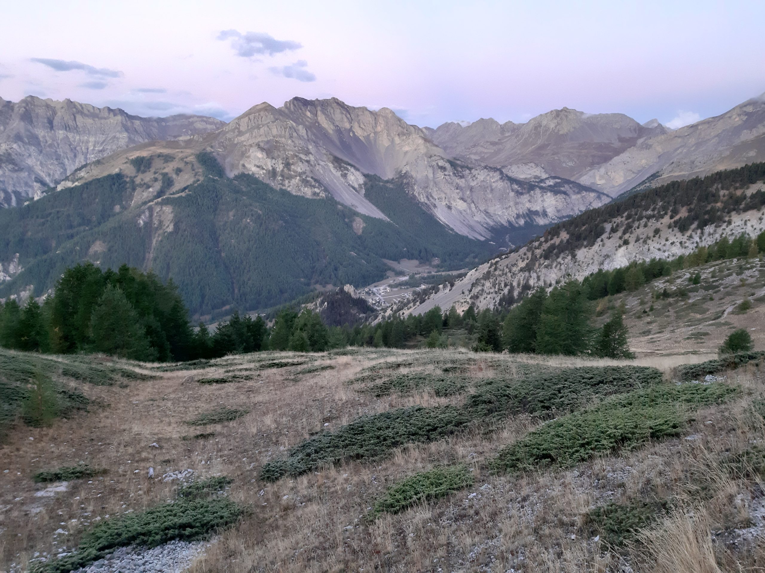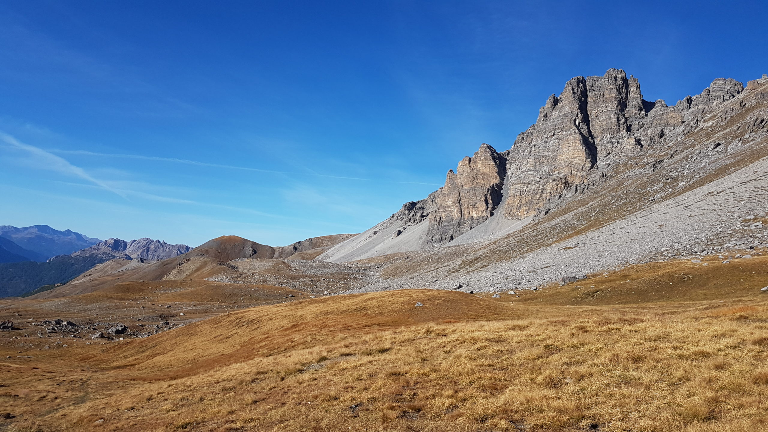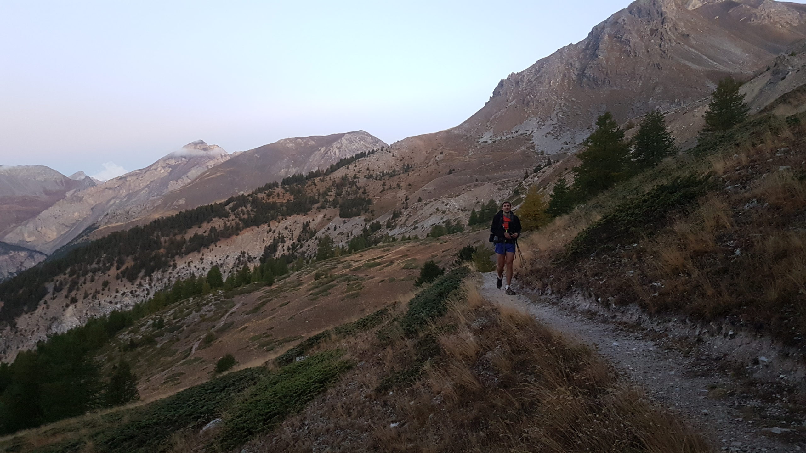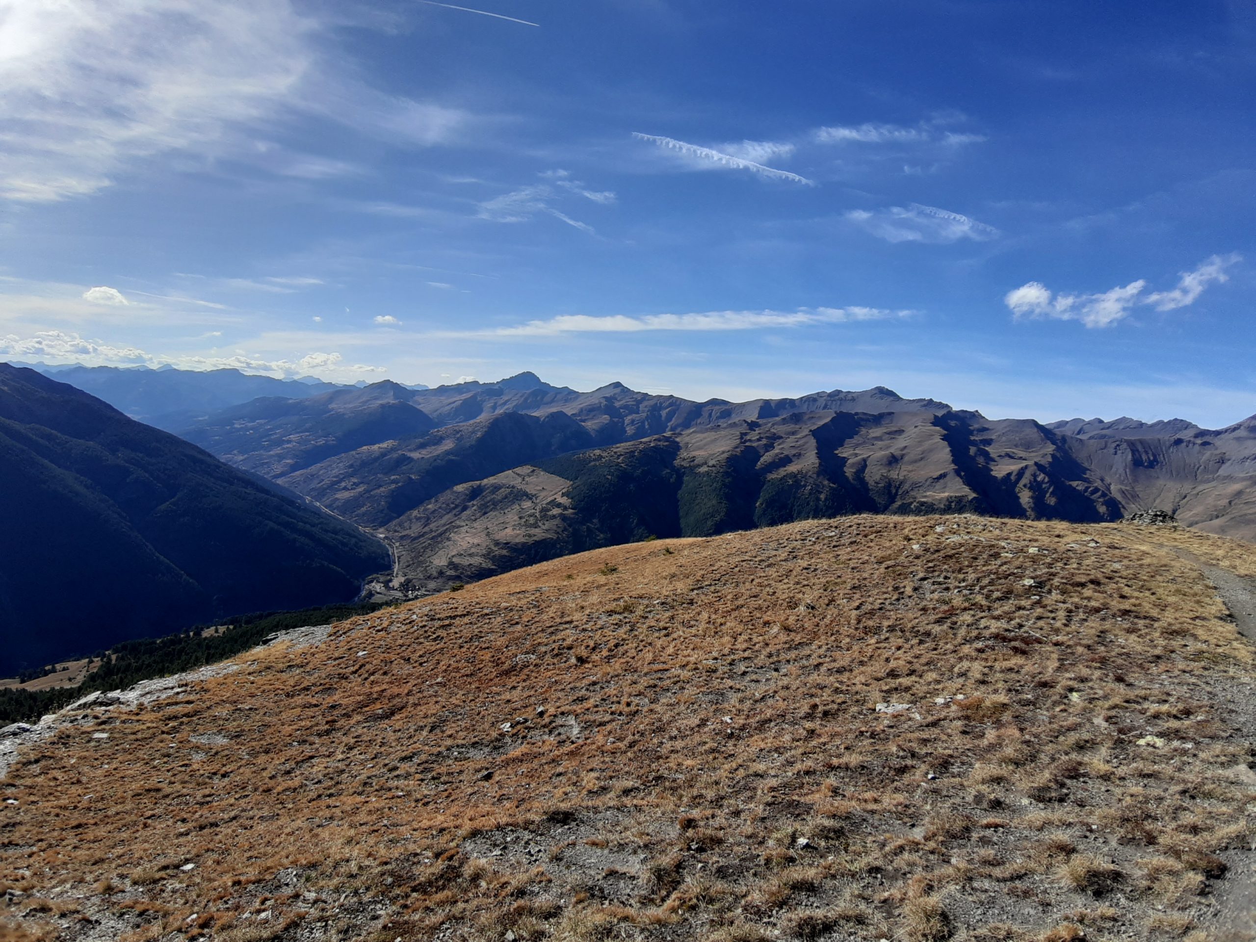A trop regarder le paysage, on arrive au col sans s’en rendre compte. Seul le vent nous ramène à la raison et nous le rappelle. La vallée de Cervières se dessine devant nous. Qu’elles sont belles ces couleurs automnales ! J’ai envie de m’asseoir et de les contempler pendant des heures, figeant chaque détail dans ma mémoire. Mais je me rappelle rapidement qu’il reste pas mal de bornes tout de même.